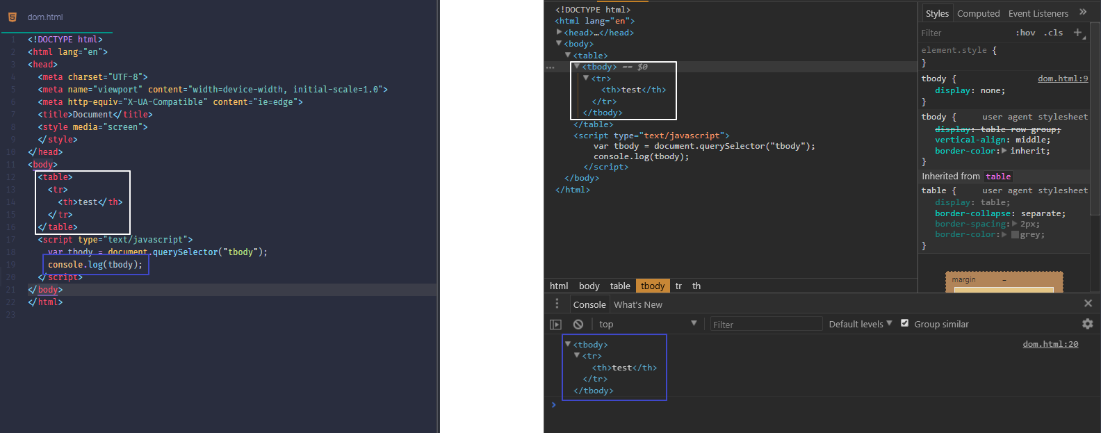<table>안에<tbody>없이<tr>,<th>를 사용한 경우 개발자 도구를 보면<tbody>가 존재한다. <tbody>는 바로 DOM에 있을것 이다.- 따라서 CSS, JavaScript으로 찾을 수 있고 스타일을 변경하거나 조작이 가능하다.